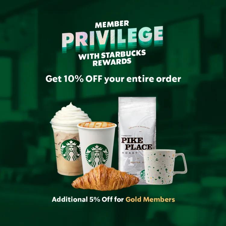 Whether it's your morning coffee or favorite snack, enjoy 10% off your entire order and an additional 5% Off for Gold Members - only with Starbucks Rewards.
