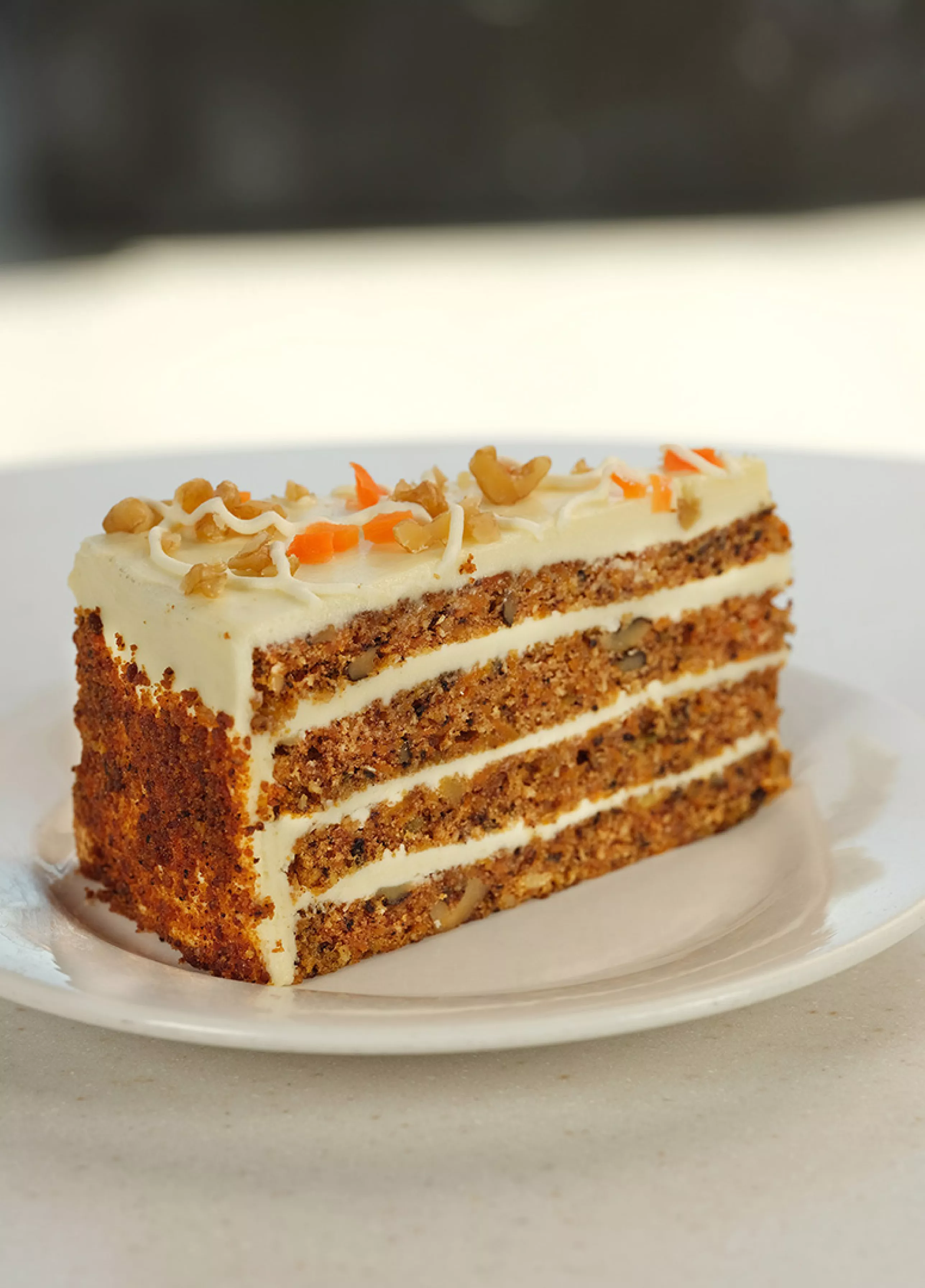 كيك ستاربكس الشهير - مع طبقات من الجوز وقطع الجزر التي تعلو جبنة كريمية سلسة ومزين بصلصة شوكولاته بيضاء.
